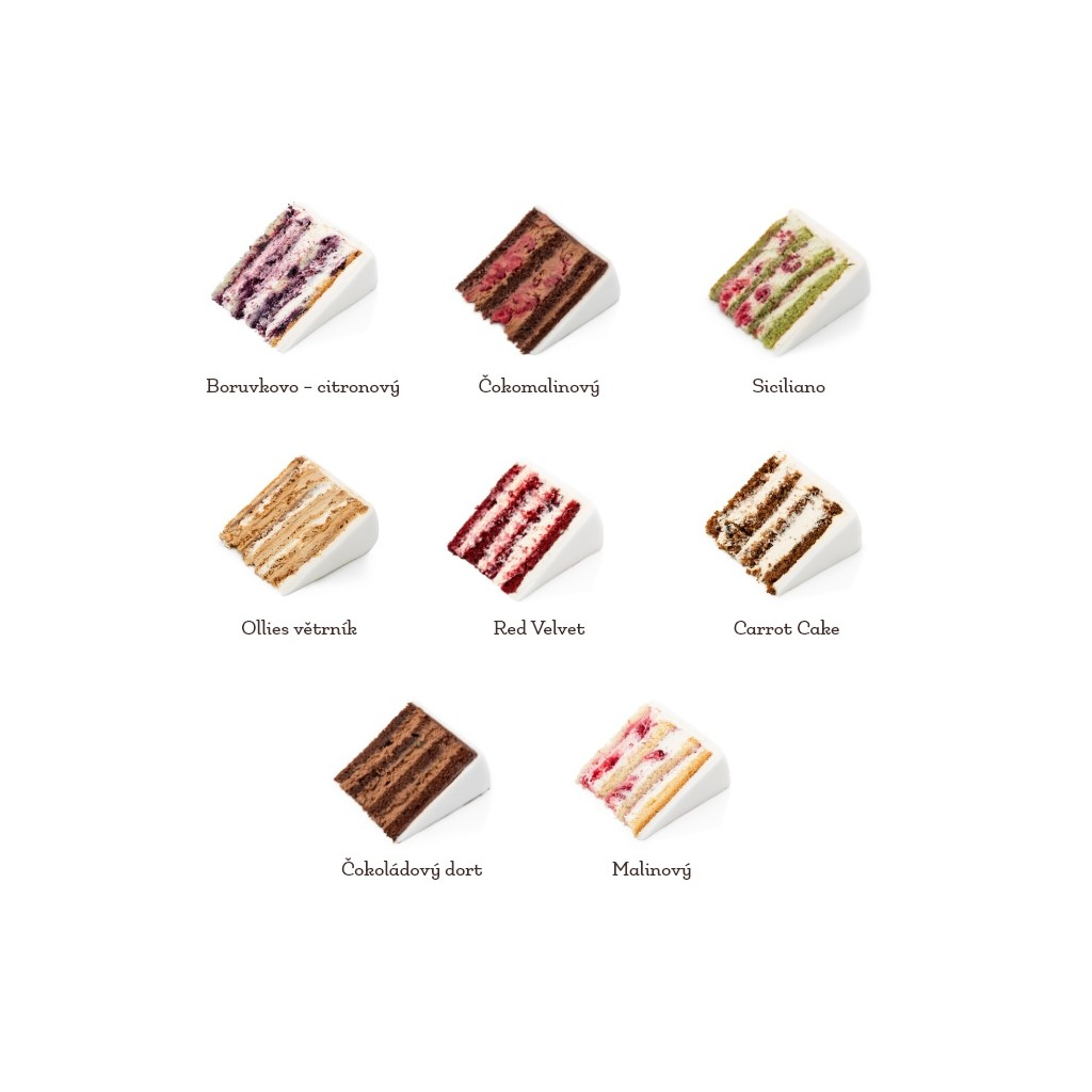 Příchuť svatebního dortu záleží pouze na vás – vyberte si z 8 lahodných kombinací tu pravou, která promění vaši svatbu v nezapomenutelný zážitek. Bude to kombinace čokolády a maliny nebo moderní red velvet? Příchuť navíc můžete vybrat pro každé jednotlivé patro.