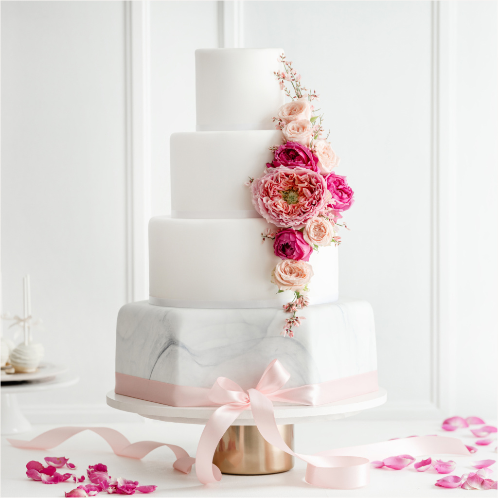 Zaujměte svatební hosty kombinací luxusu a výjimečnosti. První patro dortu dostalo originální tvar šestiúhelníku, jeho speciálnost navíc umocňuje jedinečný mramorový fondán. Díky ozdobě z čerstvých květů bude tento dort bezpochyby dominantou svatební tabule.