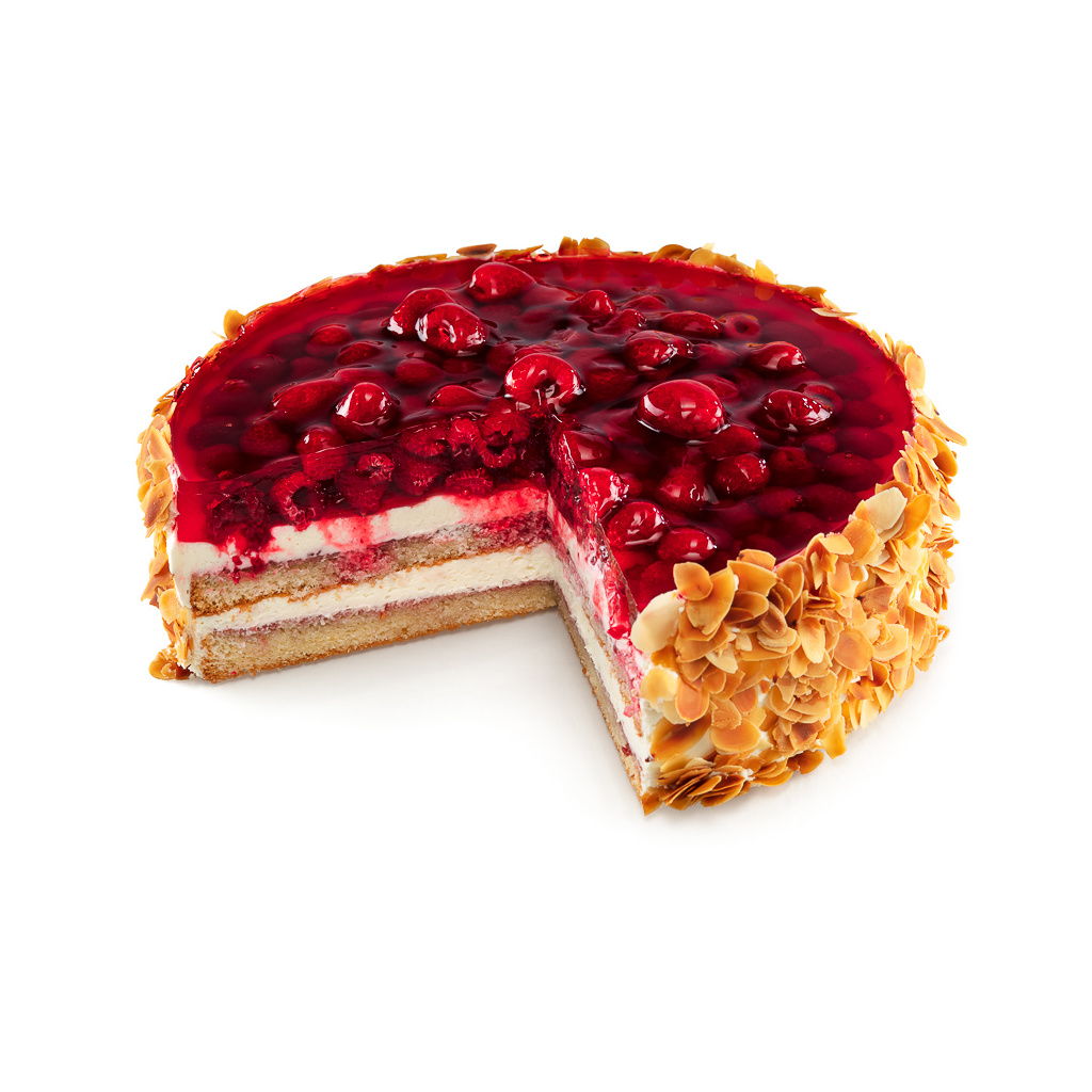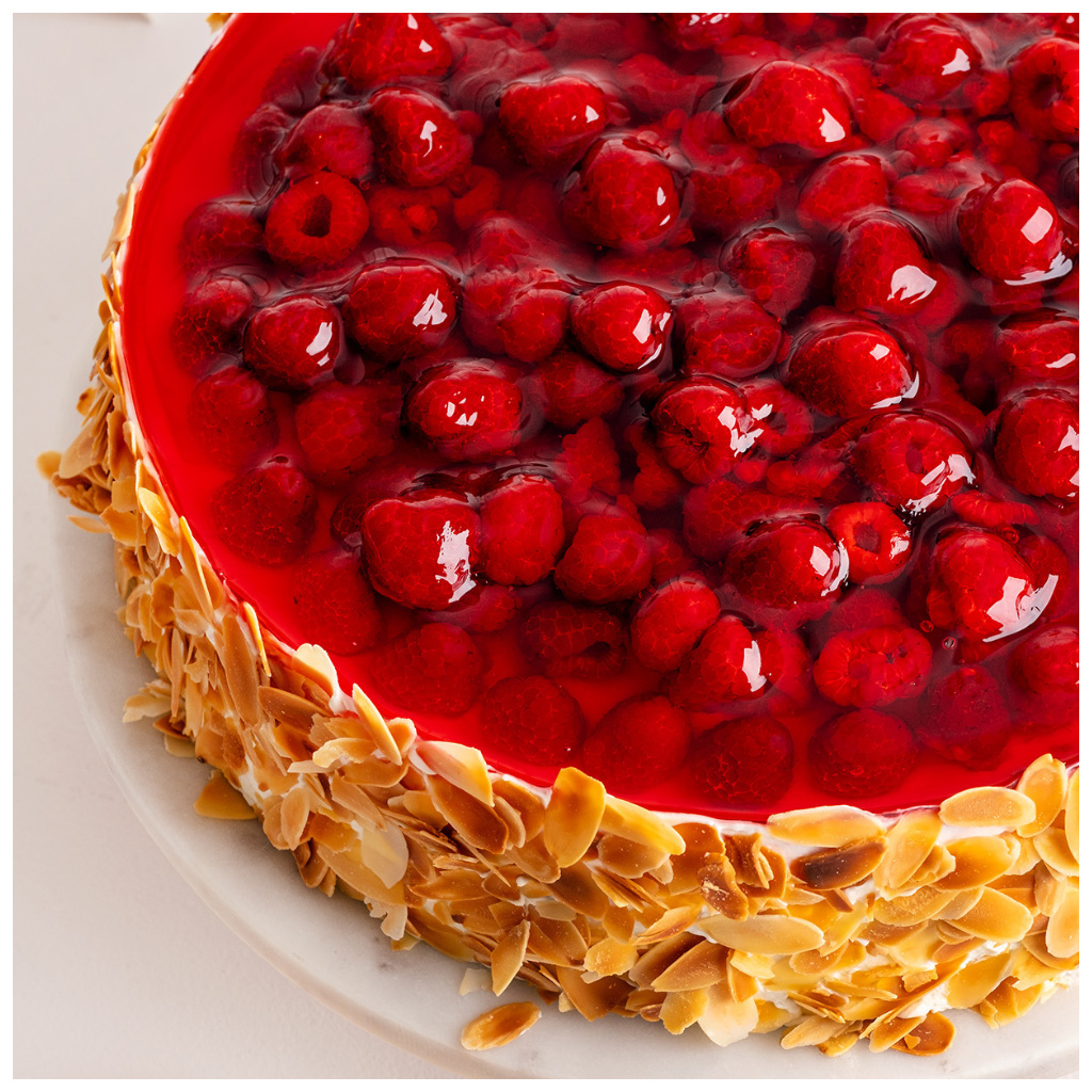 Krémové mascarpone a šťavnaté maliny – duo, které jen máloco překoná! Ochutnejte náš malinový dort s mascarpone a sami se o tom přesvědčte. Po zakousnutí se můžete těšit na dvě patra nadýchaného piškotového korpusu, který je bohatě proložený lehkým krémem z mascarpone, pokrytý šťavnatými malinami s přelivem z ovocného želé. Vršek malinového dortu zdobí pražené mandlové plátky.
