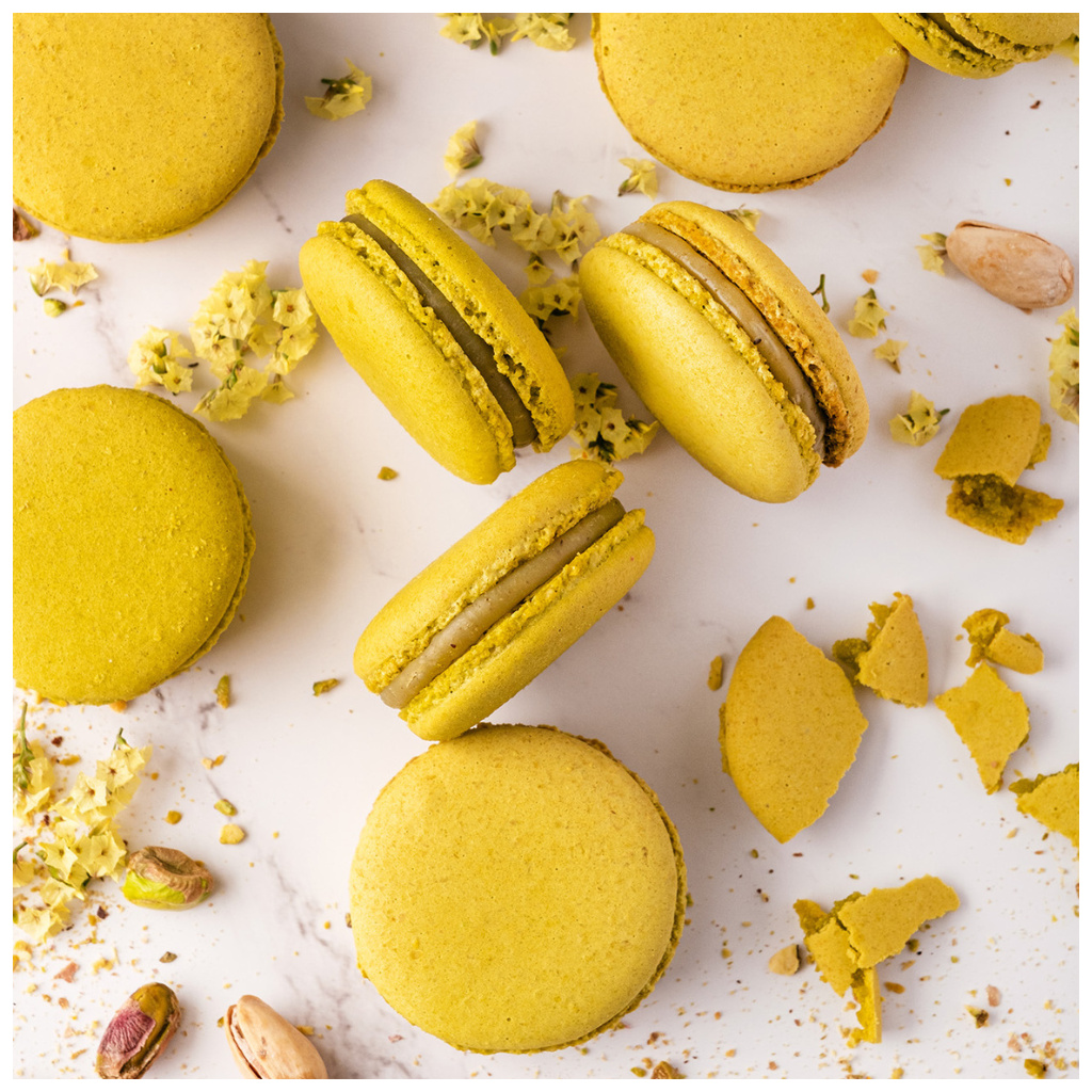 Delikátní pistáciová makronka vyrobená ze špičkové mandlové mouky z Belgie je na povrchu křupavá, ale zároveň uvnitř vláčná. Náplň pistáciové makronky tvoří bílá čokoláda a drcené měkoučké pistácie. Pistáciová makronka OLLIES zkrátka chutná jako žádná jiná na světě.